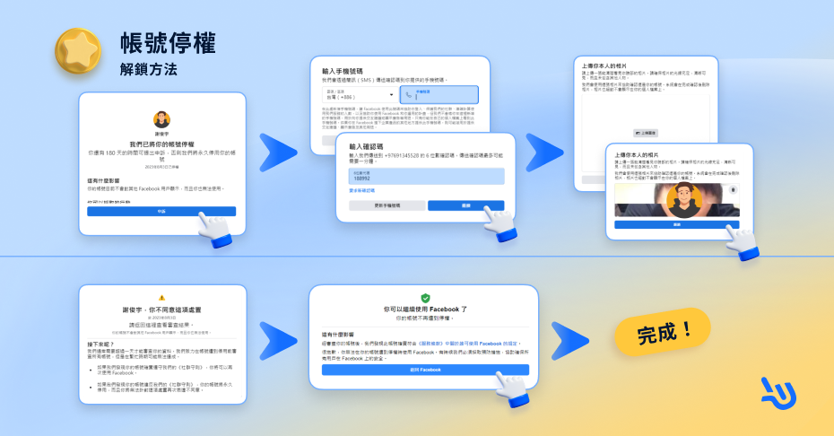 若因違反守則被停權,你需要點擊「提出申訴」,輸入電話號碼驗證並上傳本人照片進行審核。請確保照片清晰且資料與臉書帳號姓名相符。
