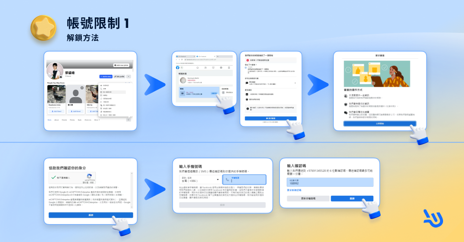 2. 確認身分:臉書會要求你證明是本人。常見方式包括: